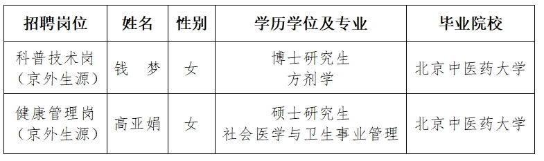 本次招聘工作中,科普技术岗(京内生源)、健康传播技术岗(京内生源)无符合招聘岗位要求人选。